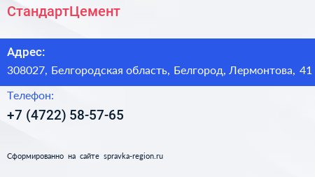 СтандартЦемент по адресу 308027, Белгородская область, Белгород, Лермонтова, 41 в дальнейшем Организация, размещена в следующих категориях: