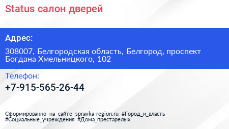 Status, салон дверей по адресу 308007, Белгородская область, Белгород, проспект Богдана Хмельницкого, 102 в дальнейшем Организация, размещена в следующих категориях: