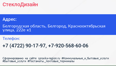 СтеклоДизайн по адресу Белгородская область, Белгород, Краснооктябрьская улица, 222е к1 в дальнейшем Организация, размещена в следующих категориях: