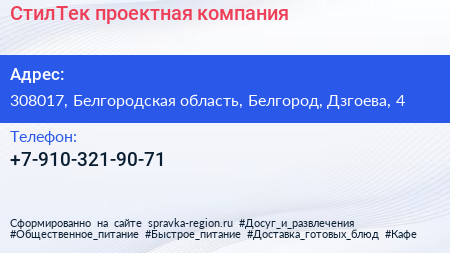 СтилТек, проектная компания по адресу 308017, Белгородская область, Белгород, Дзгоева, 4 в дальнейшем Организация, размещена в следующих категориях: