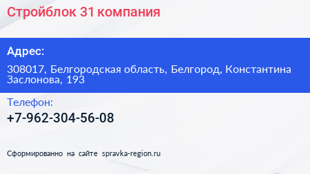 Стройблок 31, компания по адресу 308017, Белгородская область, Белгород, Константина Заслонова, 193 в дальнейшем Организация, размещена в следующих категориях:
