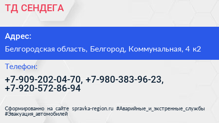 ТД СЕНДЕГА по адресу Белгородская область, Белгород, Коммунальная, 4 к2 в дальнейшем Организация, размещена в следующих категориях: