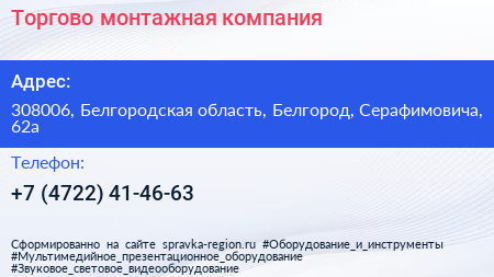 Торгово-монтажная компания по адресу 308006, Белгородская область, Белгород, Серафимовича, 62а в дальнейшем Организация, размещена в следующих категориях:
