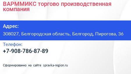 ВАРММИКС, торгово-производственная компания по адресу 308027, Белгородская область, Белгород, Пирогова, 36 в дальнейшем Организация, размещена в следующих категориях: