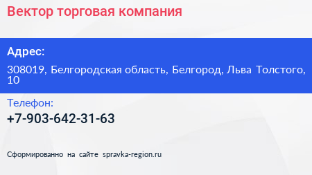 Вектор, торговая компания по адресу 308019, Белгородская область, Белгород, Льва Толстого, 10 в дальнейшем Организация, размещена в следующих категориях: