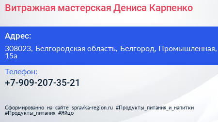 Витражная мастерская Дениса Карпенко по адресу 308023, Белгородская область, Белгород, Промышленная, 15а в дальнейшем Организация, размещена в следующих категориях: