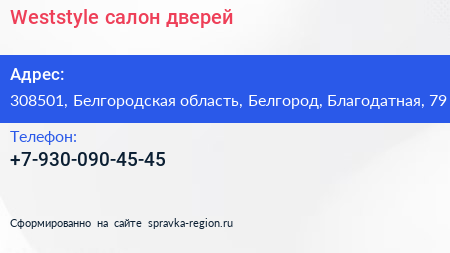 Weststyle, салон дверей по адресу 308501, Белгородская область, Белгород, Благодатная, 79 в дальнейшем Организация, размещена в следующих категориях:
