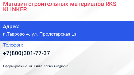 Магазин строительных материалов - RKS KLINKER по адресу п.Таврово 4, ул. Пролетарская 1а в дальнейшем Организация, размещена в следующих категориях: