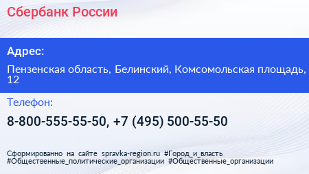 Сбербанк России по адресу Пензенская область, Белинский, Комсомольская площадь, 12 в дальнейшем Организация, размещена в следующих категориях: