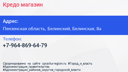 Кредо, магазин по адресу Пензенская область, Белинский, Белинская, 8а в дальнейшем Организация, размещена в следующих категориях: