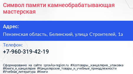 Символ памяти, камнеобрабатывающая мастерская по адресу Пензенская область, Белинский, улица Строителей, 1а в дальнейшем Организация, размещена в следующих категориях: