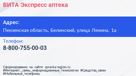 ВИТА Экспресс, аптека по адресу Пензенская область, Белинский, улица Ленина, 1а в дальнейшем Организация, размещена в следующих категориях: