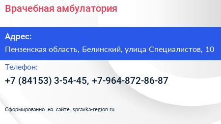 Врачебная амбулатория по адресу Пензенская область, Белинский, улица Специалистов, 10 в дальнейшем Организация, размещена в следующих категориях: