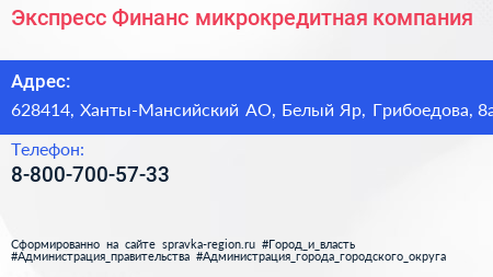 Экспресс Финанс, микрокредитная компания по адресу 628414, Ханты-Мансийский АО, Белый Яр, Грибоедова, 8а в дальнейшем Организация, размещена в следующих категориях: