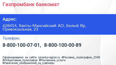 Газпромбанк, банкомат по адресу 628414, Ханты-Мансийский АО, Белый Яр, Привокзальная, 23 в дальнейшем Организация, размещена в следующих категориях: