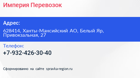 Империя Перевозок по адресу 628414, Ханты-Мансийский АО, Белый Яр, Привокзальная, 27 в дальнейшем Организация, размещена в следующих категориях:
