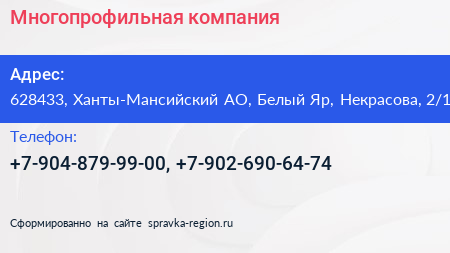 Многопрофильная компания по адресу 628433, Ханты-Мансийский АО, Белый Яр, Некрасова, 2/1 в дальнейшем Организация, размещена в следующих категориях: