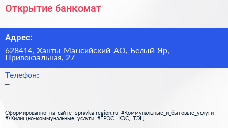 Открытие, банкомат по адресу 628414, Ханты-Мансийский АО, Белый Яр, Привокзальная, 27 в дальнейшем Организация, размещена в следующих категориях: