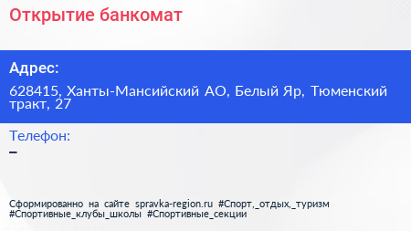 Открытие, банкомат по адресу 628415, Ханты-Мансийский АО, Белый Яр, Тюменский тракт, 27 в дальнейшем Организация, размещена в следующих категориях: