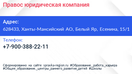 Правос, юридическая компания по адресу 628433, Ханты-Мансийский АО, Белый Яр, Есенина, 15/1 в дальнейшем Организация, размещена в следующих категориях: