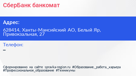 СберБанк, банкомат по адресу 628414, Ханты-Мансийский АО, Белый Яр, Привокзальная, 27 в дальнейшем Организация, размещена в следующих категориях:
