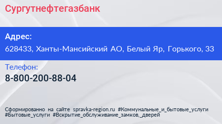 Сургутнефтегазбанк по адресу 628433, Ханты-Мансийский АО, Белый Яр, Горького, 33 в дальнейшем Организация, размещена в следующих категориях: