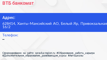 ВТБ, банкомат по адресу 628414, Ханты-Мансийский АО, Белый Яр, Привокзальная, 16/2 в дальнейшем Организация, размещена в следующих категориях: