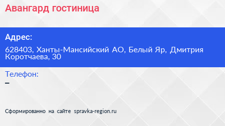 Авангард, гостиница по адресу 628403, Ханты-Мансийский АО, Белый Яр, Дмитрия Коротчаева, 30 в дальнейшем Организация, размещена в следующих категориях: