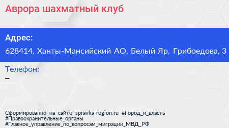 Аврора, шахматный клуб по адресу 628414, Ханты-Мансийский АО, Белый Яр, Грибоедова, 3 в дальнейшем Организация, размещена в следующих категориях: