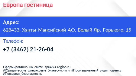 Европа, гостиница по адресу 628433, Ханты-Мансийский АО, Белый Яр, Горького, 15 в дальнейшем Организация, размещена в следующих категориях: