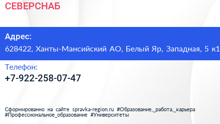СЕВЕРСНАБ по адресу 628422, Ханты-Мансийский АО, Белый Яр, Западная, 5 к1 в дальнейшем Организация, размещена в следующих категориях: