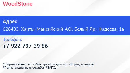 WoodStone по адресу 628433, Ханты-Мансийский АО, Белый Яр, Фадеева, 1а в дальнейшем Организация, размещена в следующих категориях: