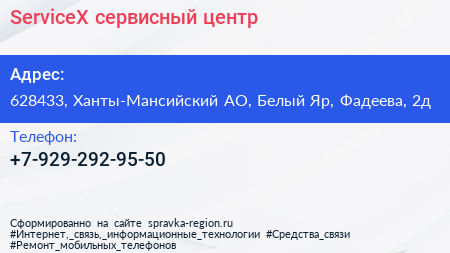 ServiceX, сервисный центр по адресу 628433, Ханты-Мансийский АО, Белый Яр, Фадеева, 2д в дальнейшем Организация, размещена в следующих категориях: