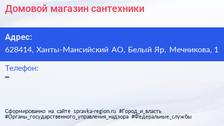 Домовой, магазин сантехники по адресу 628414, Ханты-Мансийский АО, Белый Яр, Мечникова, 1 в дальнейшем Организация, размещена в следующих категориях: