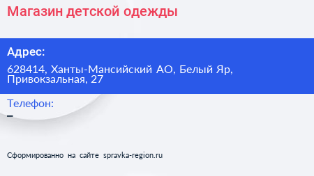 Магазин детской одежды по адресу 628414, Ханты-Мансийский АО, Белый Яр, Привокзальная, 27 в дальнейшем Организация, размещена в следующих категориях: