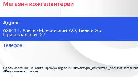 Магазин кожгалантереи по адресу 628414, Ханты-Мансийский АО, Белый Яр, Привокзальная, 27 в дальнейшем Организация, размещена в следующих категориях: