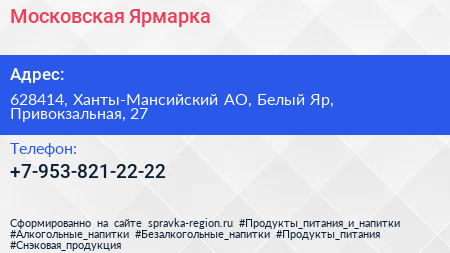 Московская Ярмарка по адресу 628414, Ханты-Мансийский АО, Белый Яр, Привокзальная, 27 в дальнейшем Организация, размещена в следующих категориях: