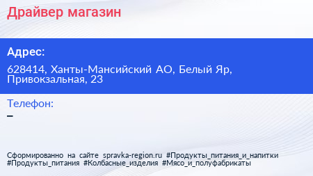 Драйвер, магазин по адресу 628414, Ханты-Мансийский АО, Белый Яр, Привокзальная, 23 в дальнейшем Организация, размещена в следующих категориях: