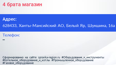 4 брата, магазин по адресу 628433, Ханты-Мансийский АО, Белый Яр, Шукшина, 16а в дальнейшем Организация, размещена в следующих категориях: