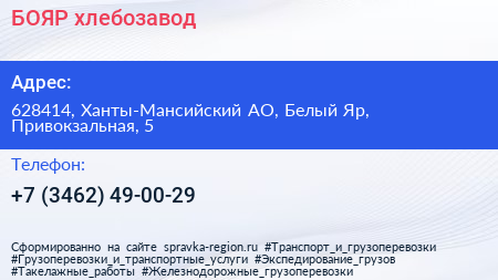БОЯР, хлебозавод по адресу 628414, Ханты-Мансийский АО, Белый Яр, Привокзальная, 5 в дальнейшем Организация, размещена в следующих категориях: