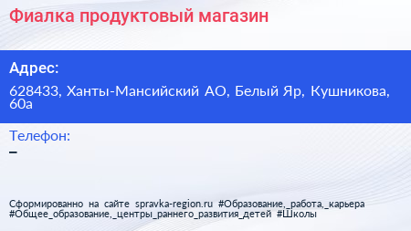 Фиалка, продуктовый магазин по адресу 628433, Ханты-Мансийский АО, Белый Яр, Кушникова, 60а в дальнейшем Организация, размещена в следующих категориях: