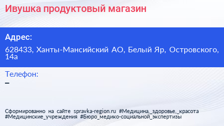 Ивушка, продуктовый магазин по адресу 628433, Ханты-Мансийский АО, Белый Яр, Островского, 14а в дальнейшем Организация, размещена в следующих категориях: