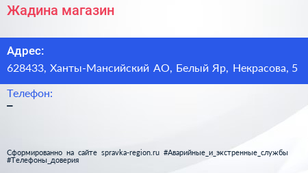 Жадина, магазин по адресу 628433, Ханты-Мансийский АО, Белый Яр, Некрасова, 5 в дальнейшем Организация, размещена в следующих категориях: