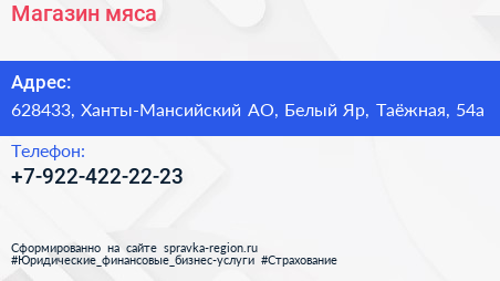Магазин мяса по адресу 628433, Ханты-Мансийский АО, Белый Яр, Таёжная, 54а в дальнейшем Организация, размещена в следующих категориях:
