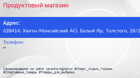 Продуктовый магазин по адресу 628414, Ханты-Мансийский АО, Белый Яр, Толстого, 28/1 в дальнейшем Организация, размещена в следующих категориях: