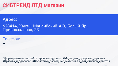 СИБТРЕЙД ЛТД, магазин по адресу 628414, Ханты-Мансийский АО, Белый Яр, Привокзальная, 23 в дальнейшем Организация, размещена в следующих категориях: