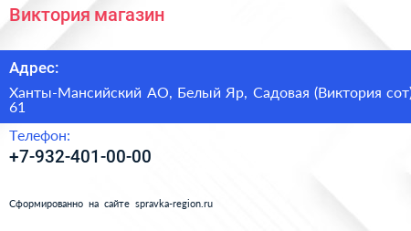 Виктория, магазин по адресу Ханты-Мансийский АО, Белый Яр, Садовая (Виктория сот), 61 в дальнейшем Организация, размещена в следующих категориях: