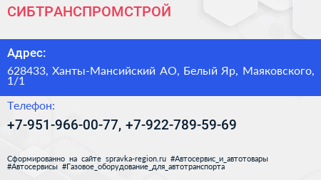 СИБТРАНСПРОМСТРОЙ по адресу 628433, Ханты-Мансийский АО, Белый Яр, Маяковского, 1/1 в дальнейшем Организация, размещена в следующих категориях: