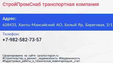 СтройПромСнаб, транспортная компания по адресу 628433, Ханты-Мансийский АО, Белый Яр, Береговая, 3/1 в дальнейшем Организация, размещена в следующих категориях:
