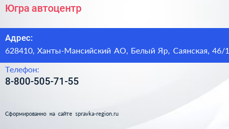Югра, автоцентр по адресу 628410, Ханты-Мансийский АО, Белый Яр, Саянская, 46/1 в дальнейшем Организация, размещена в следующих категориях: